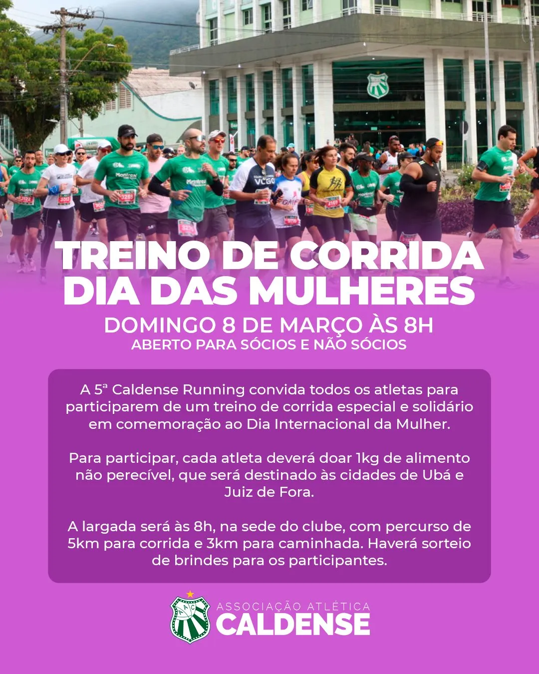 A 5ª Caldense Running, promovida pela Associação Atlética Caldense, realiza neste domingo, 8 de março, um treino especial e solidário em celebração ao Dia Internacional da Mulher. A atividade é aberta ao público e não exige inscrição prévia.