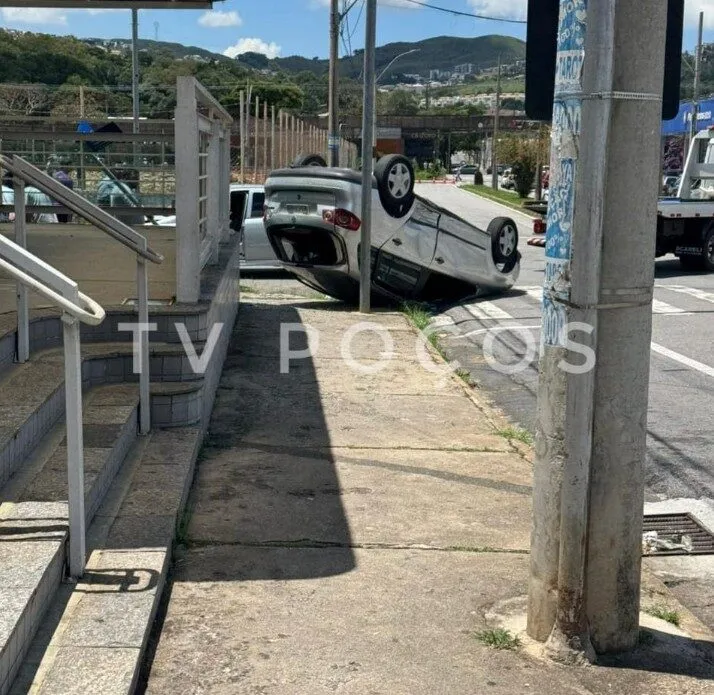 Veículo capota após colisão na zona oeste de Poços