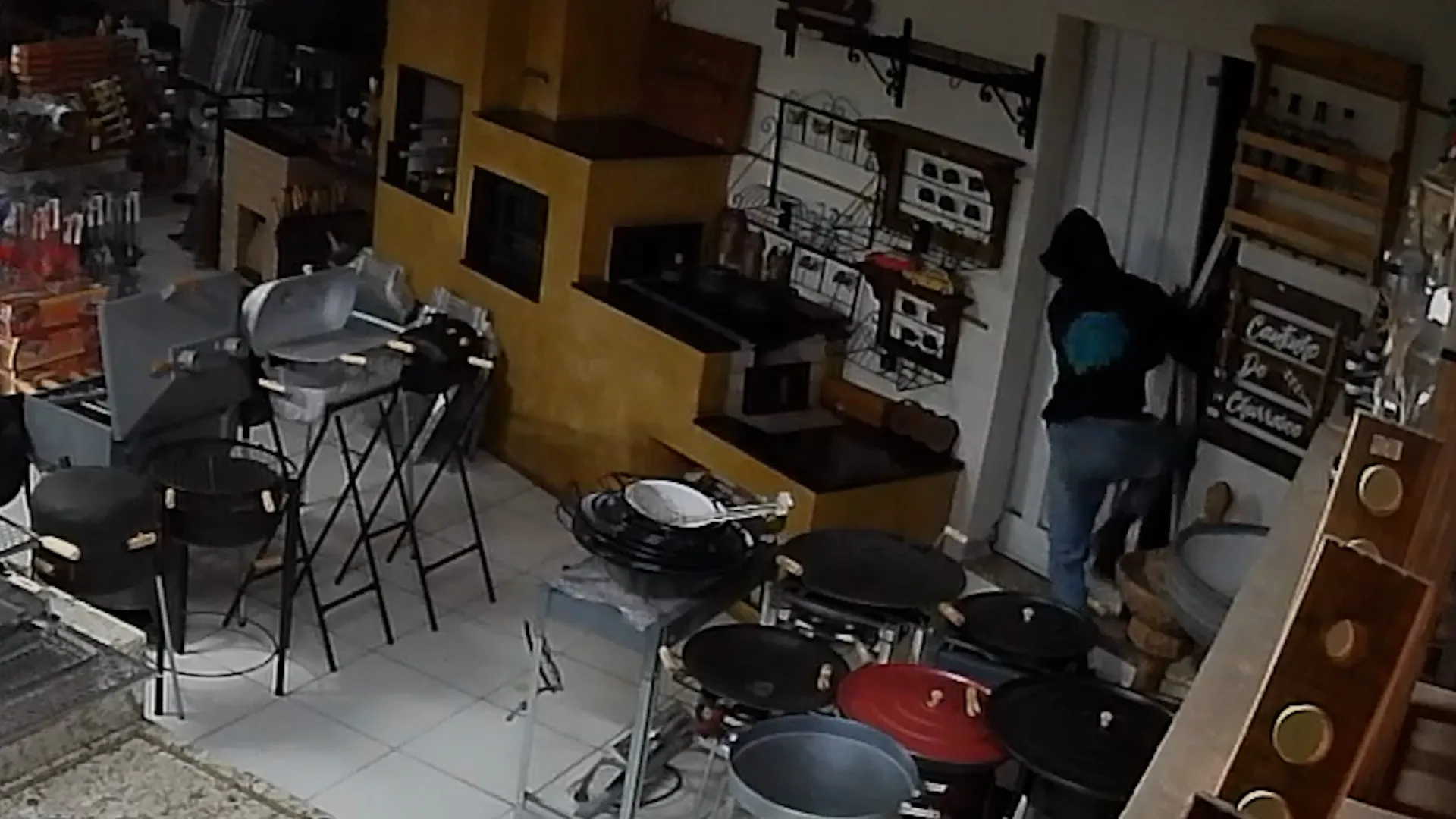 Imagens de câmeras de segurança mostram o autor no interior do local. Segundo os registros, o suspeito quebrou a estrutura de uma das portas de acesso, rastejou pelo interior da loja e, em seguida, fugiu levando uma caixa com diversos produtos.