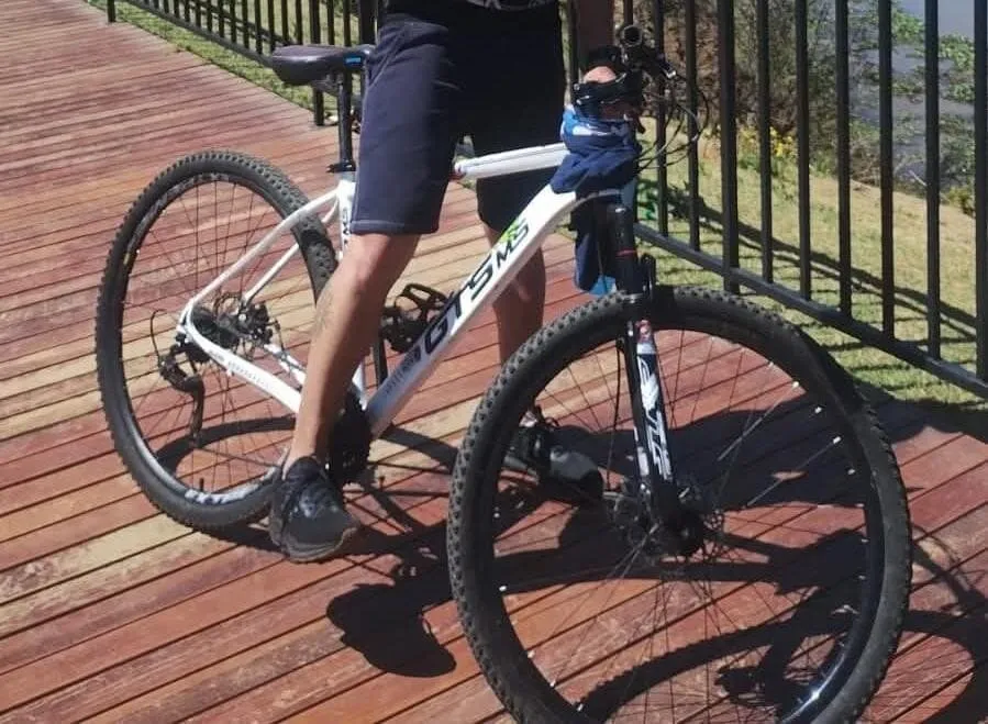 Imagens de câmeras de segurança mostram a chegada do suspeito ao local. No vídeo, é possível ver o homem pulando o portão do condomínio e, em seguida, furtando uma bicicleta GTS, de cor branca, aro 29.