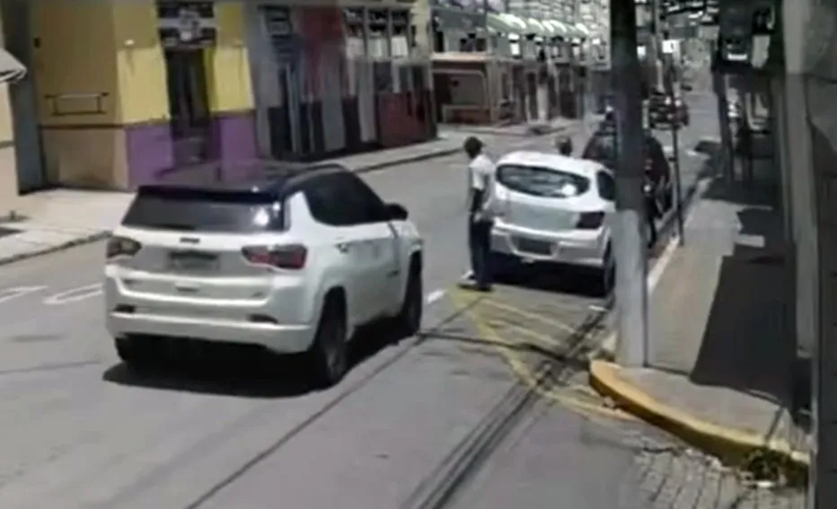 Imagens de câmeras de monitoramento registraram o momento exato em que o homem caminhava pela via quando um veículo colidiu contra outro automóvel que estava estacionado. Com o impacto, o carro atingido foi projetado em direção à calçada, passando muito próximo do pedestre, que conseguiu se afastar rapidamente.